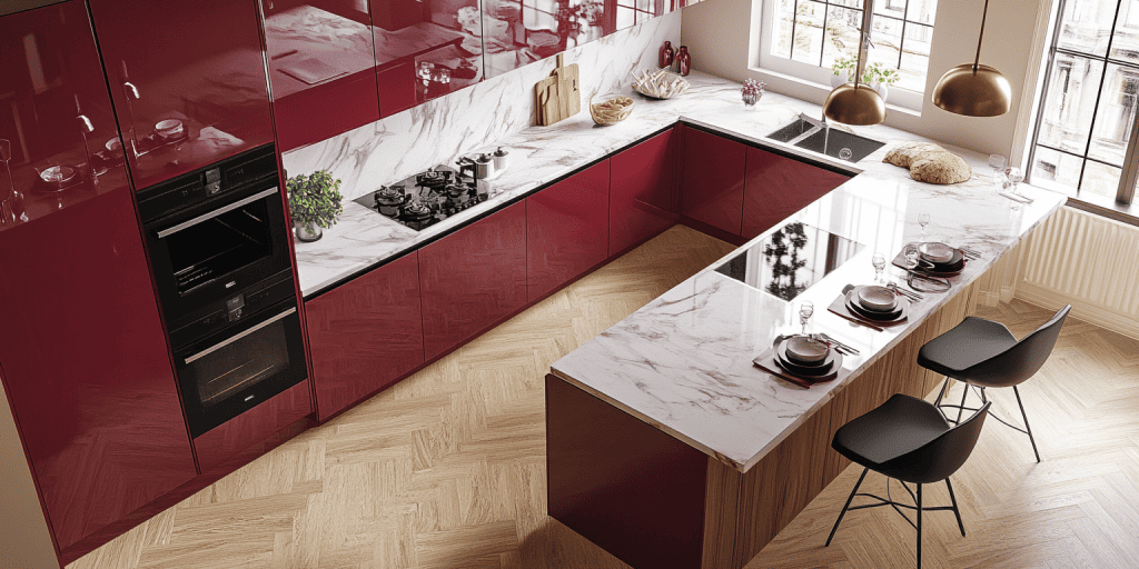 This U-shaped layout combines glossy burgundy cabinets with a white marble worktop for a balanced, elegant look. A perfect example of burgundy and cream kitchen ideas, it offers timeless appeal. Wondering what colour goes best with burgundy? White marble is a classic choice.