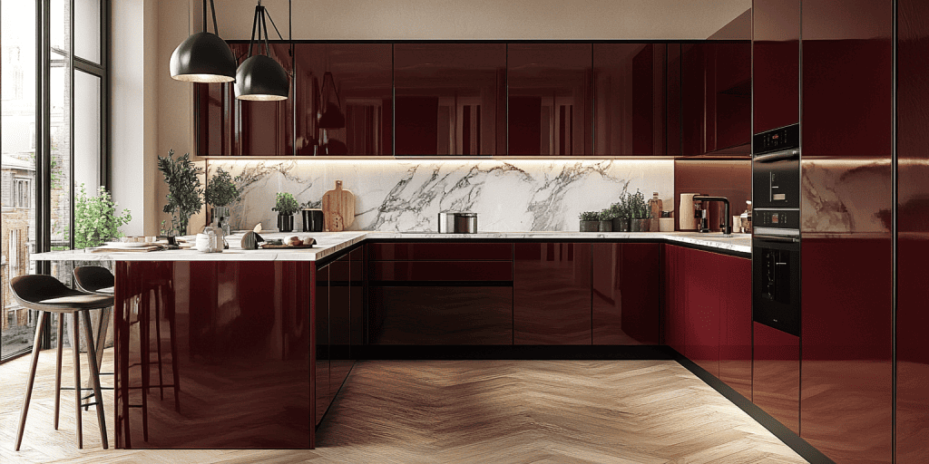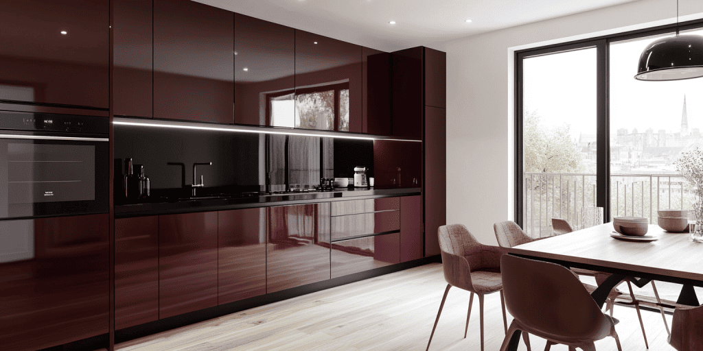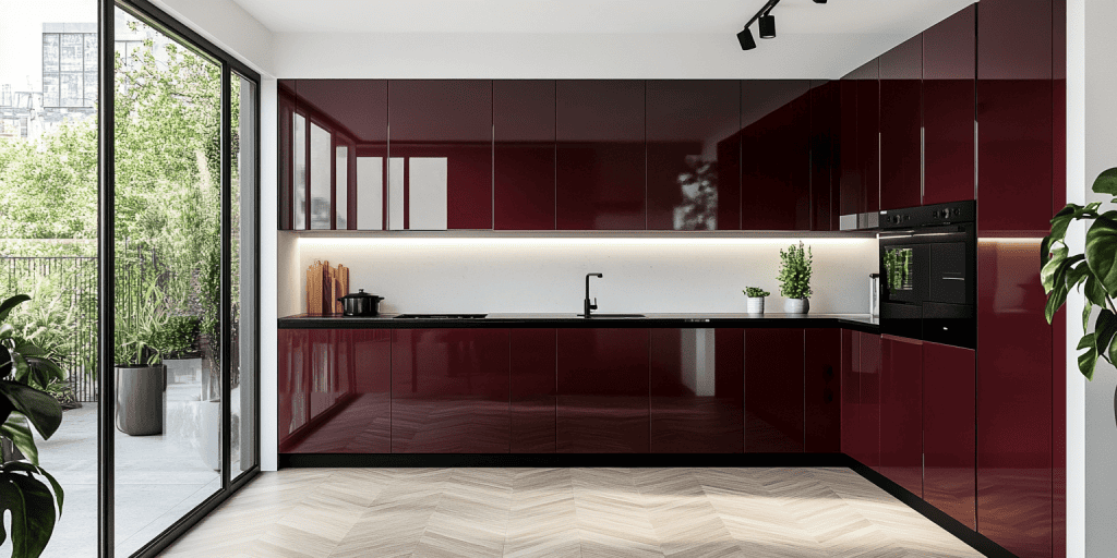 Glossy burgundy cabinets bring a polished, high-end feel to this kitchen. A standout among burgundy kitchen ideas UK, this design reflects light beautifully and pairs well with matte black hardware. It’s a first choice for those who love bold kitchen ideas with a sleek finish.