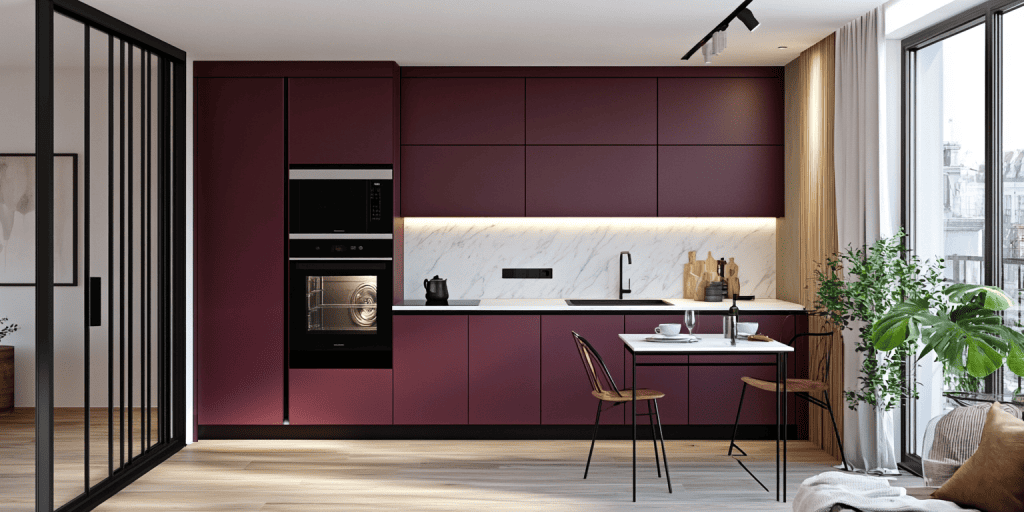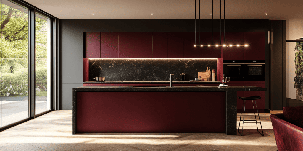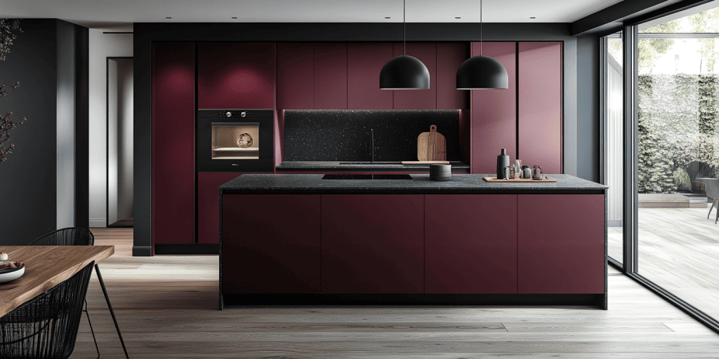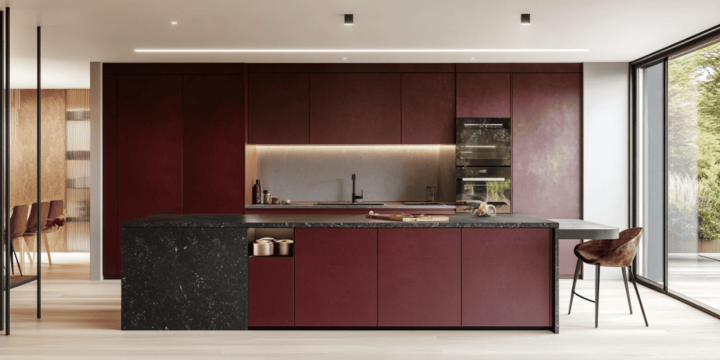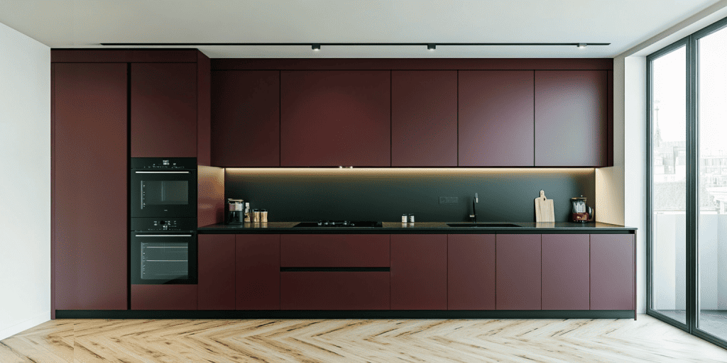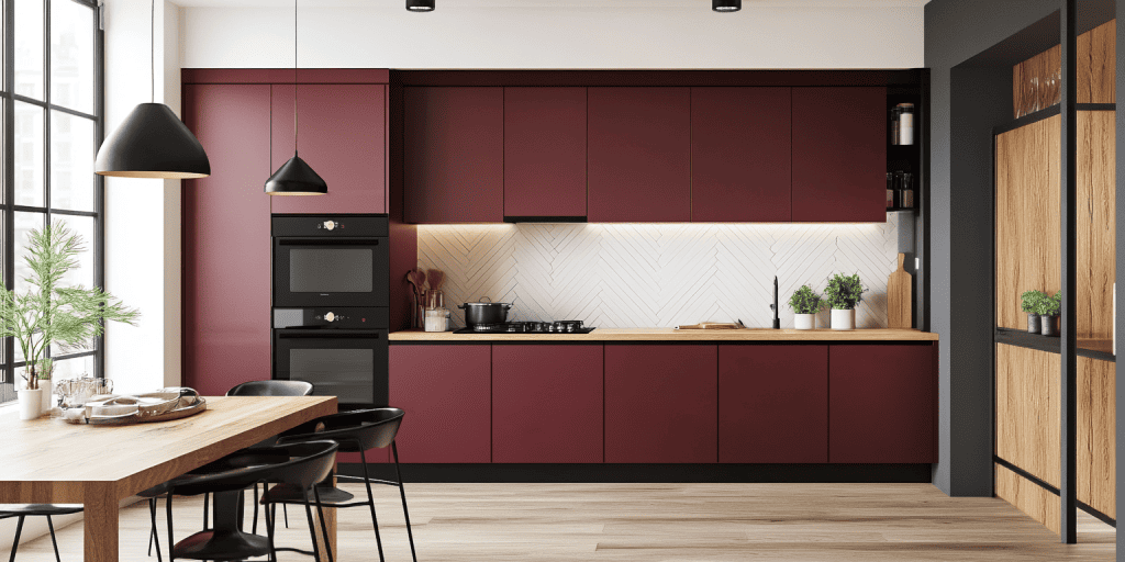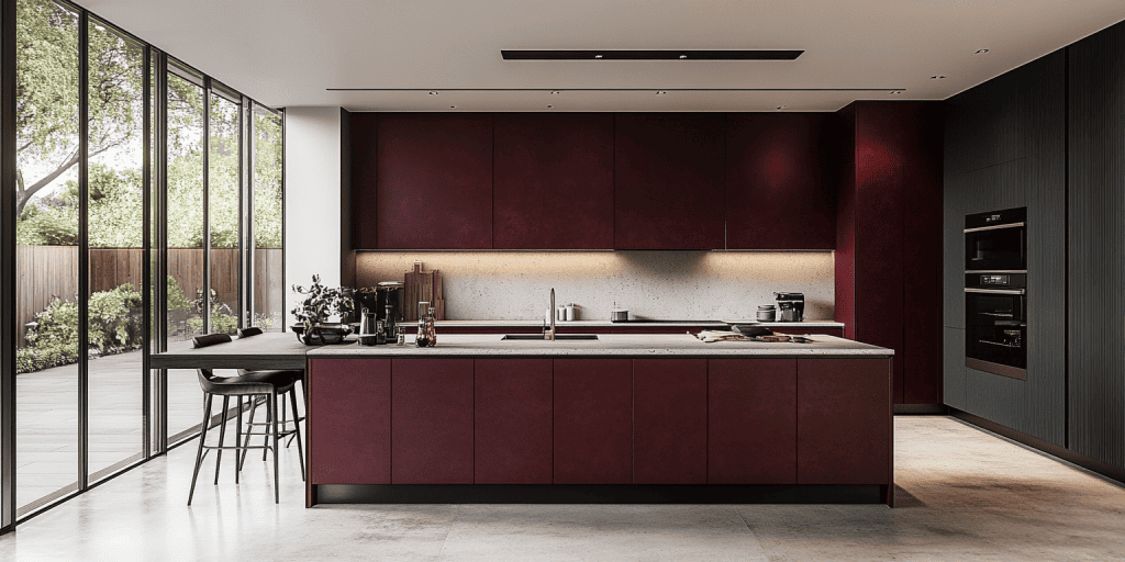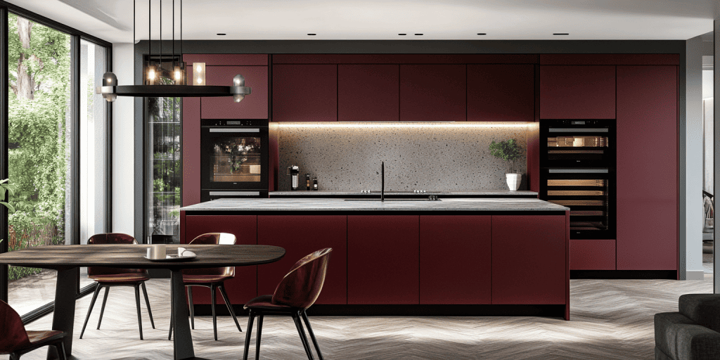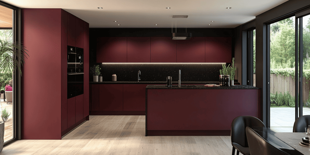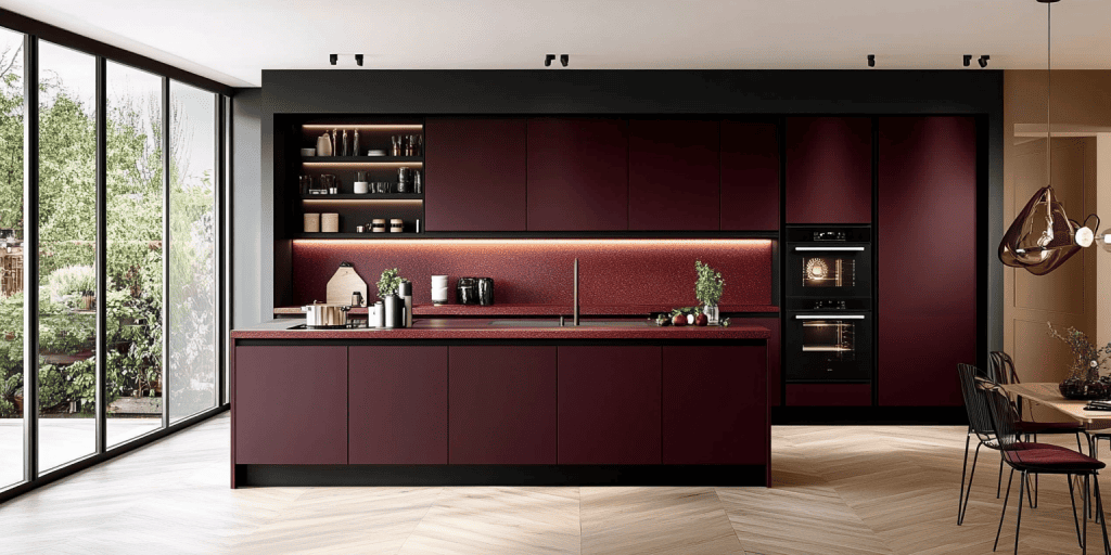 This sleek, handleless layout showcases modern burgundy kitchen cabinet ideas with matte finishes and black channels. If you’re looking for minimalist kitchens with clean lines and a subtle appearance, then it’s perfect for UK homes. Explore more of burgundy kitchen decor ideas UK that combine clean lines with bold colours for a refined and clutter-free aesthetic.