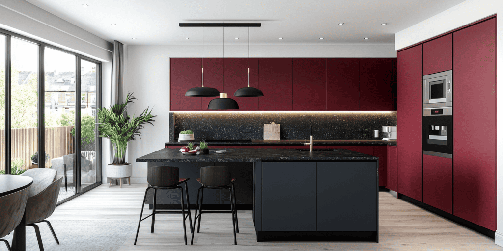 Brushed black fittings add industrial charm to this modern burgundy kitchen. A standout among burgundy kitchen ideas, it’s perfect for UK homes seeking edge elegance. Explore burgundy kitchen wall ideas and tile design for a cohesive finish.
