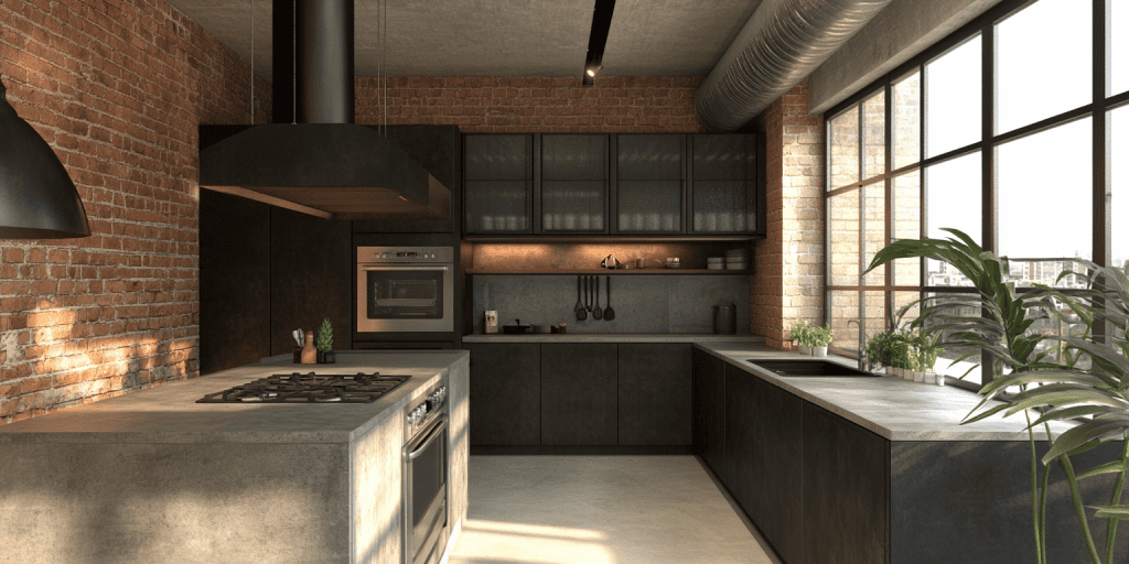 A bold black-and-grey palette seamlessly anchors this industrial kitchen style UK. Safety and practicality come first with fire-safe finishes, strong cabinetry and easy-to-maintain surfaces. And, you get everything with a bespoke industrial inspired kitchen manufactured by a reputed company. The overall look in such industrial style kitchen balances industrial toughness with a refined modern edge, ideal for UK interiors.