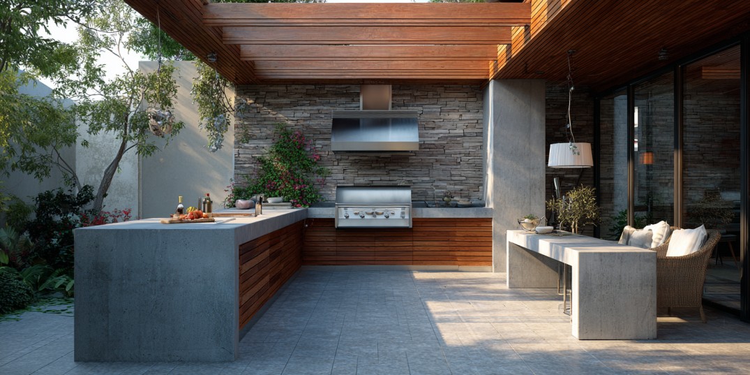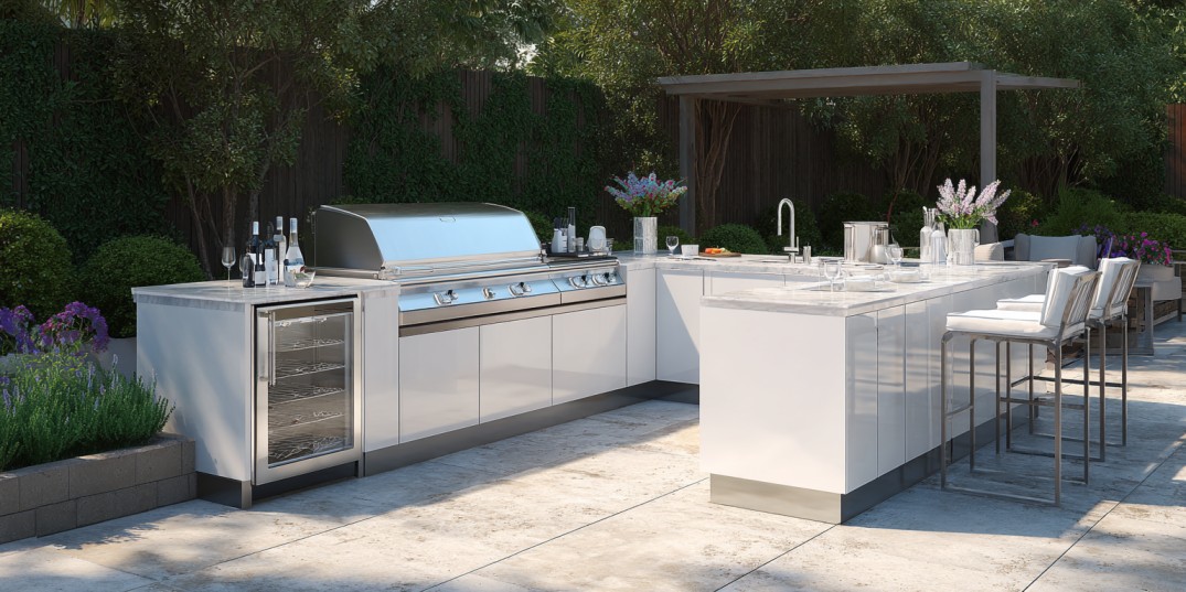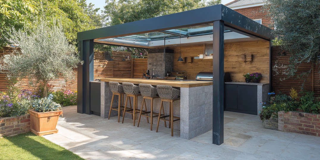 Compact yet clever, this small outdoor kitchen is perfect for terraces and small garden spaces. The corner placement ensures that the maximum area of the garden can be used for other entertainment and relaxing activities. Ideal for urban UK homes, it’s a budget-friendly outdoor kitchen design UK that still delivers big on style.