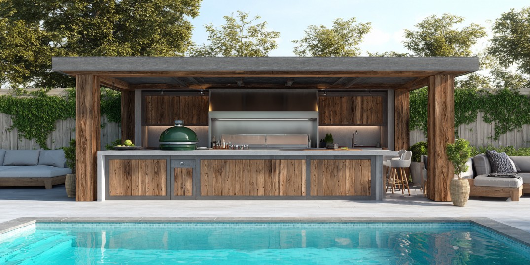 Amongst the stylish outdoor BBQ kitchen ideas, this poolside kitchen is perfect for entertaining. It’s like a dream kitchen for cooking enthusiasts. With a sleek grey finish, this poolside kitchen design scores high on both style and functionality. Whether you’re grilling burgers or hosting a summer soiree, this setup ensures that everything is always spot on.