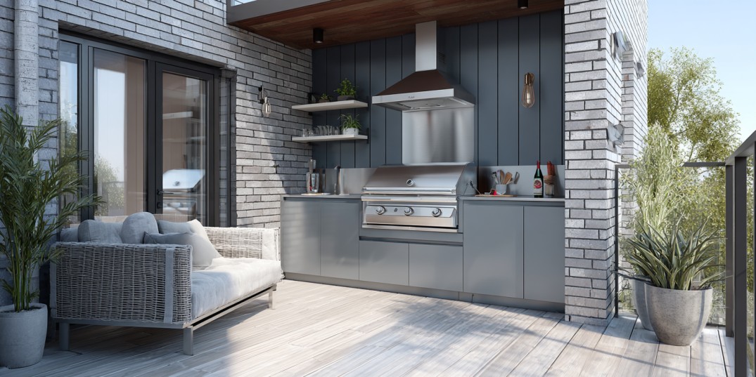 This kitchen stands amidst the most clever small outdoor kitchen ideas that brilliantly utilise the space. This light coloured kitchen and budget kitchen design has a stainless steel grill with multiple knobs. The counterspace on the sides can be used as prep area. You can easily customise it by reaching out to our reliable kitchen company UK.