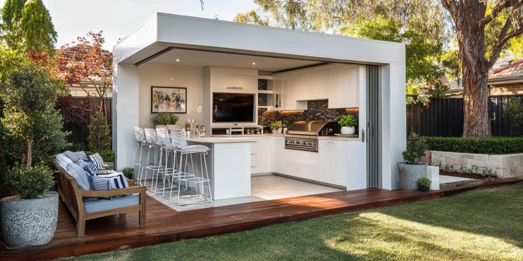 Looking for an open kitchen outside your home in the backyard area. Watch out for this beautiful L-shaped outdoor kitchen installed after the extension. The kitchen sits beautifully under the pergola. The neutral palette and clean lines make it versatile for any outdoor setting.