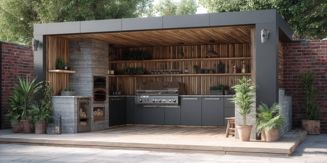 Terrace kitchens are in trend, and this grey-toned beauty is leading the way. Compact yet functional, it’s designed for city dwellers who want to enjoy alfresco cooking without needing a large garden. The smart layout and durable materials make it a top pick for affordable terrace outdoor kitchen ideas UK.