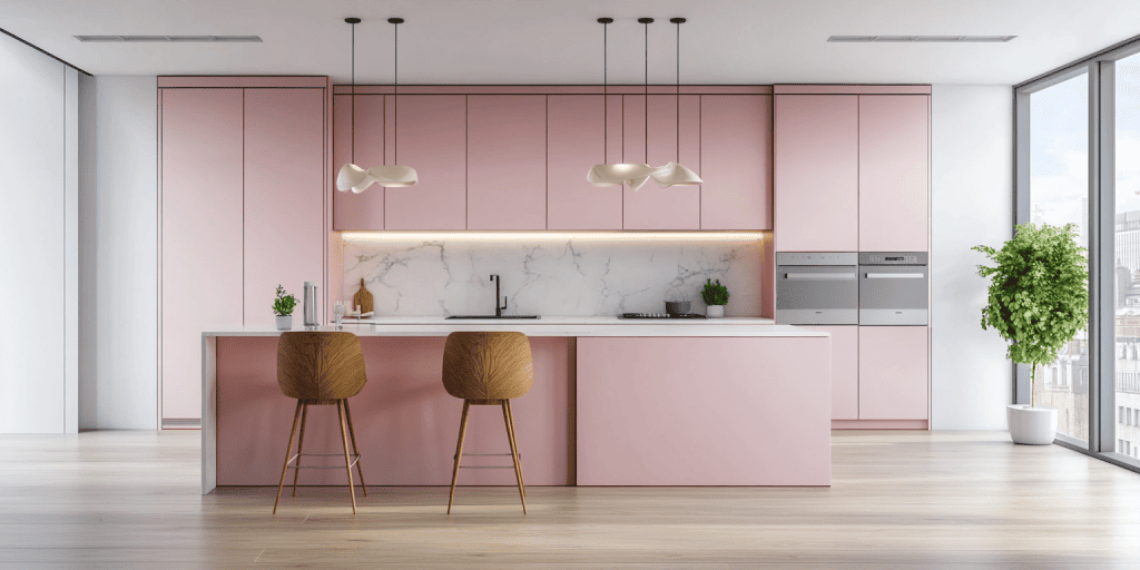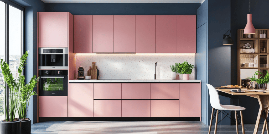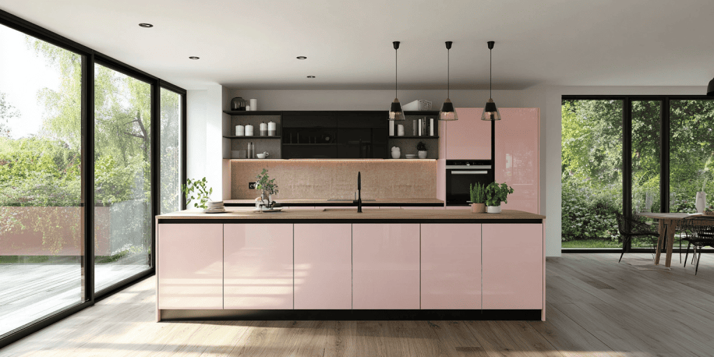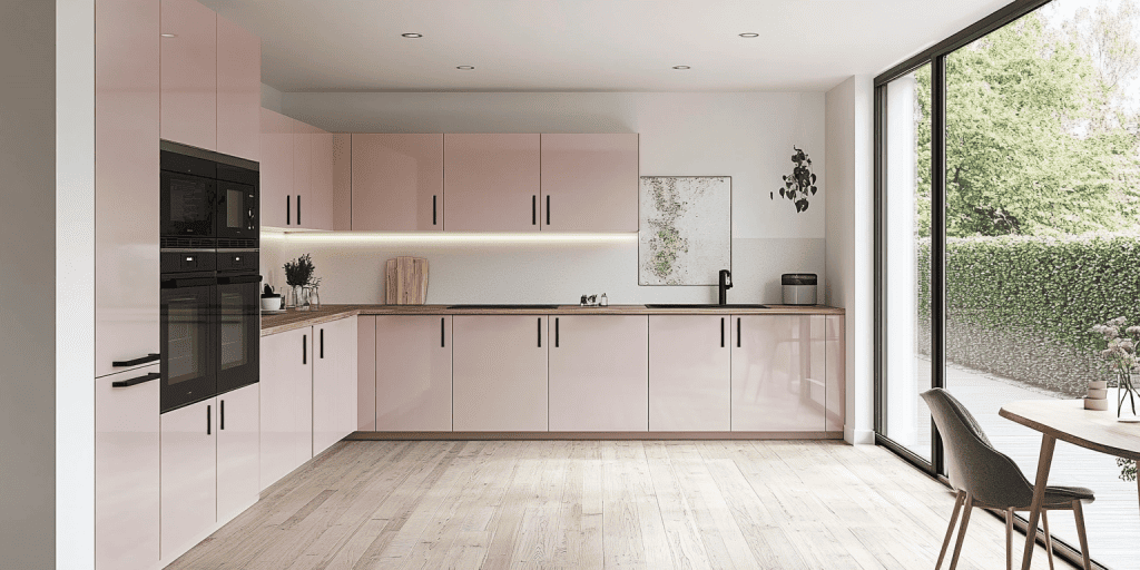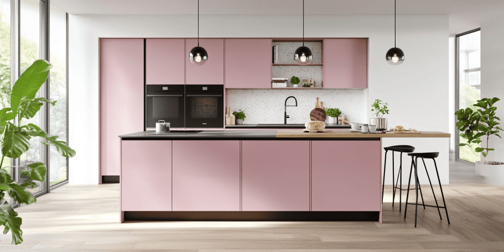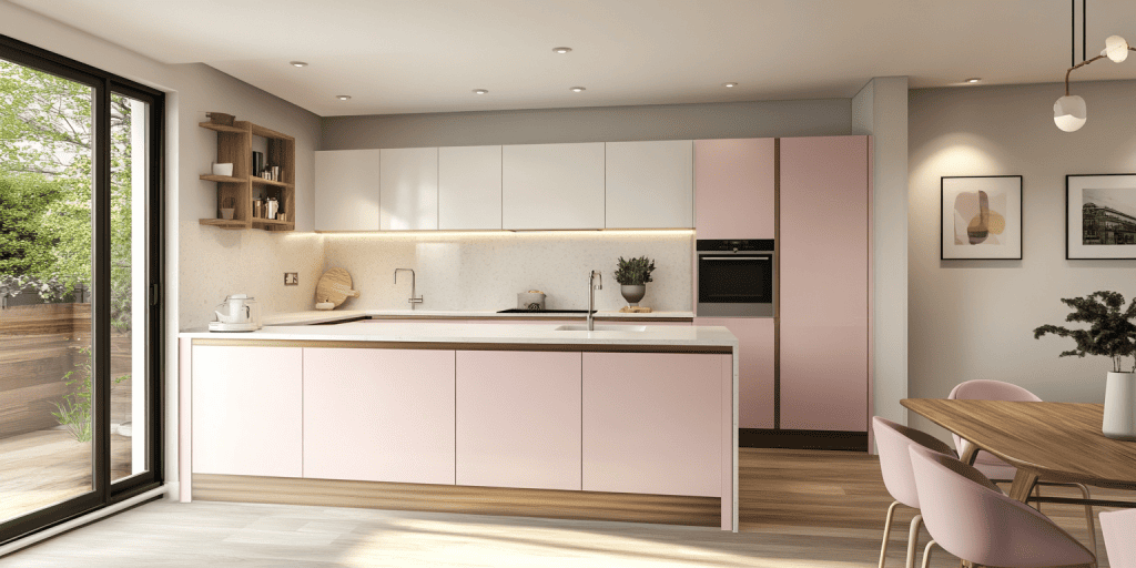 Flat door cabinetry in pink tones gives this kitchen a clean, modern finish. This design is simple and impactful and is perfect for minimalist interiors. The versatile look suits various layouts and adds a fresh, contemporary touch to any home.