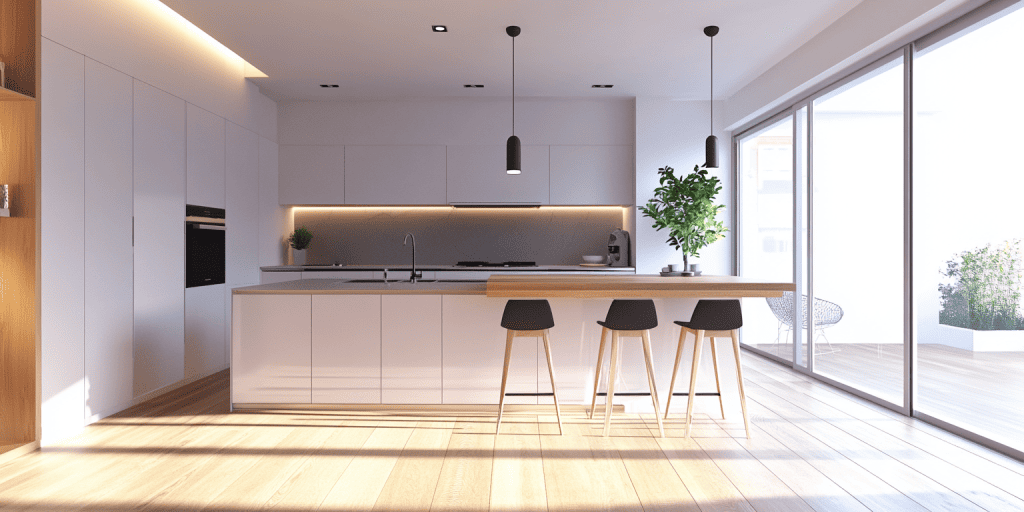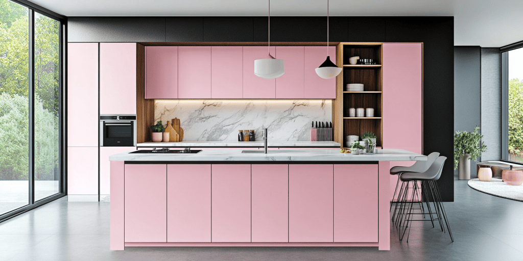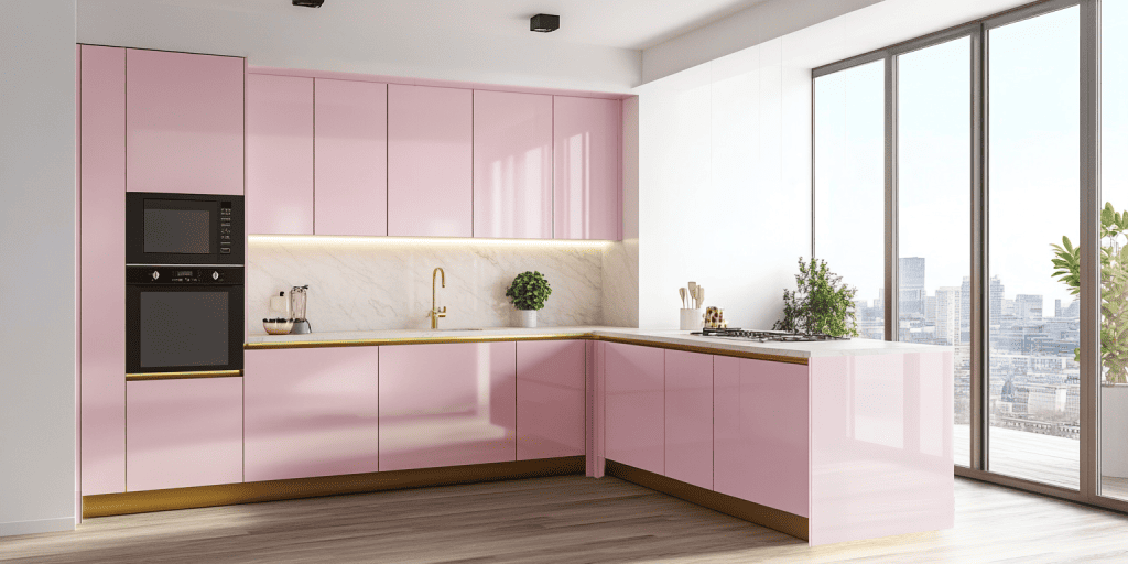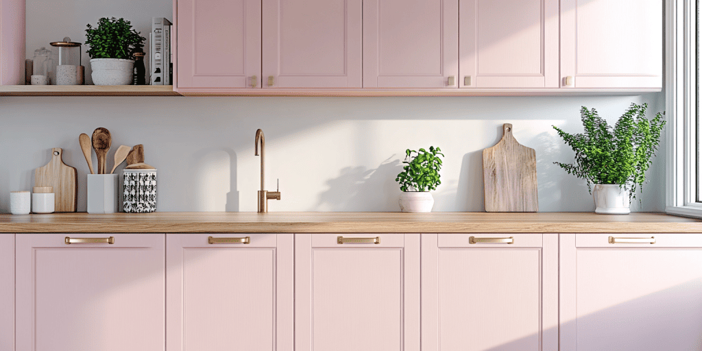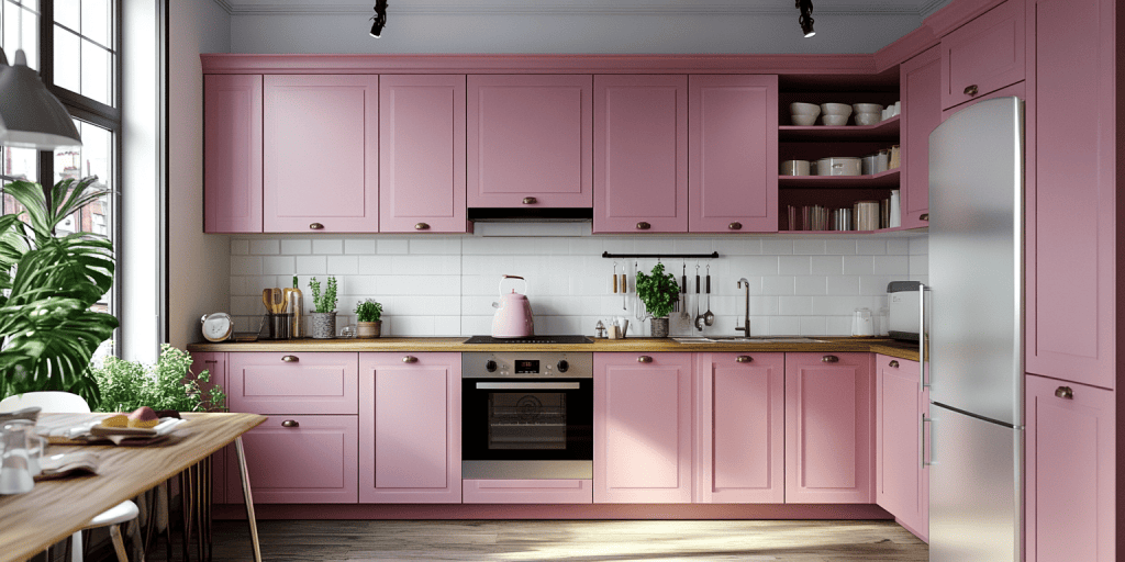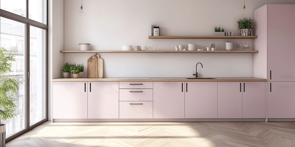 Flat door cabinetry in pink tones gives this kitchen a clean, modern finish. This design is simple and impactful and is perfect for minimalist interiors. The versatile look suits various layouts and adds a fresh, contemporary touch to any home.