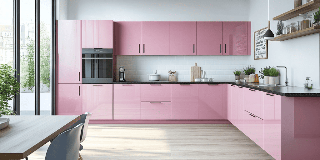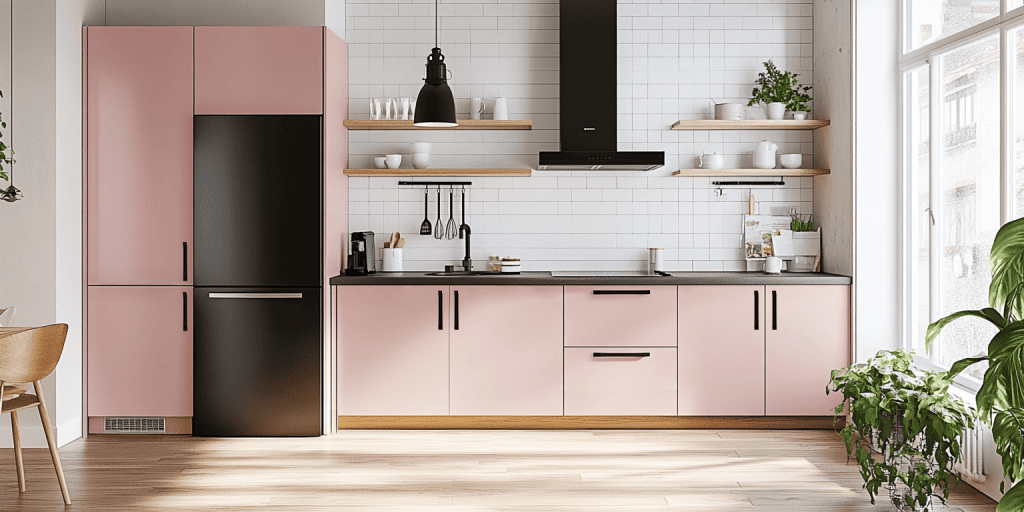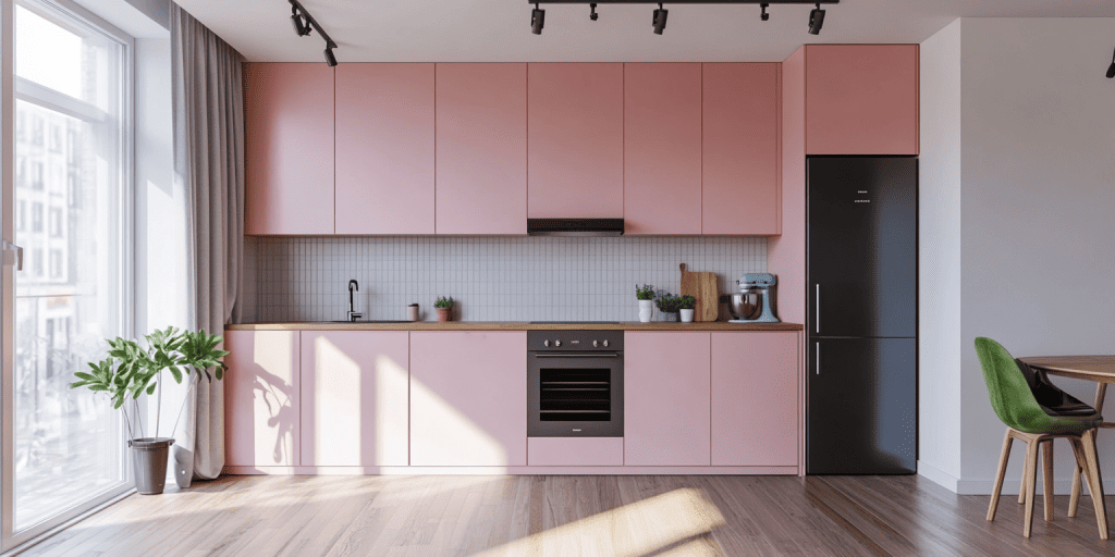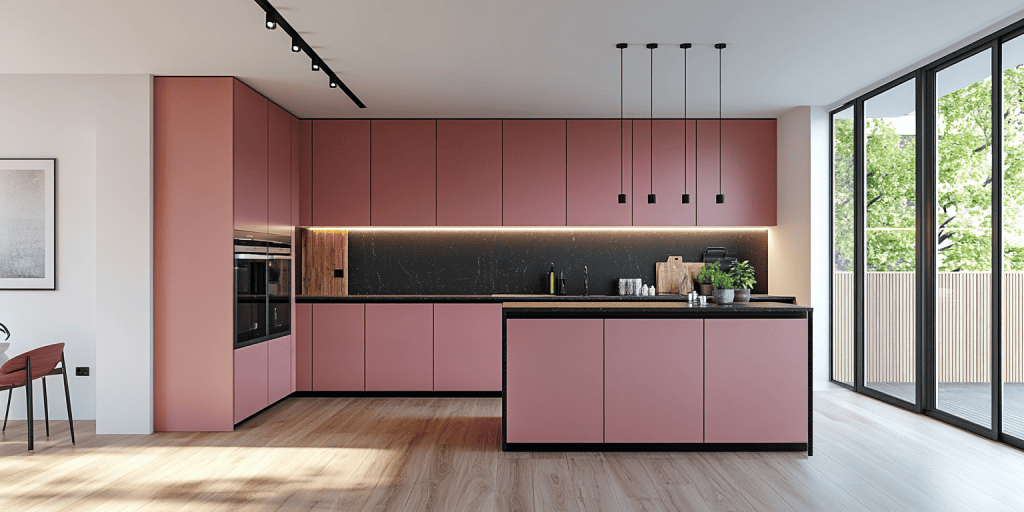 Looking for some budget pink kitchen ideas UK that are stylish and in-trend? This L-shaped kitchen layout features rich pink kitchen cabinets with black edge profiling. Certainly, adding to personality and flair. The design maximises corner space and flow. It’s ideal for medium-sized homes.