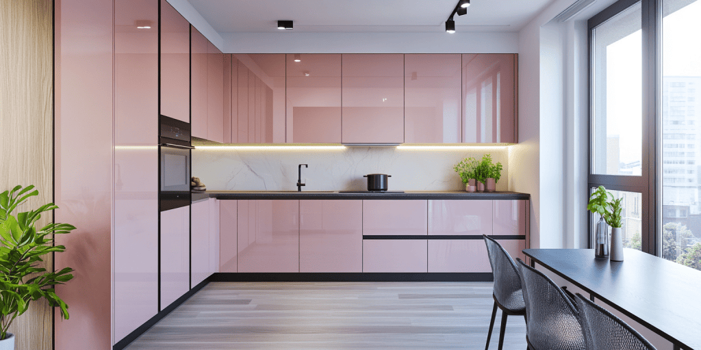 6. Modern L-shape Layout With Pink Kitchen Cabinets
