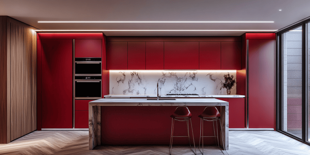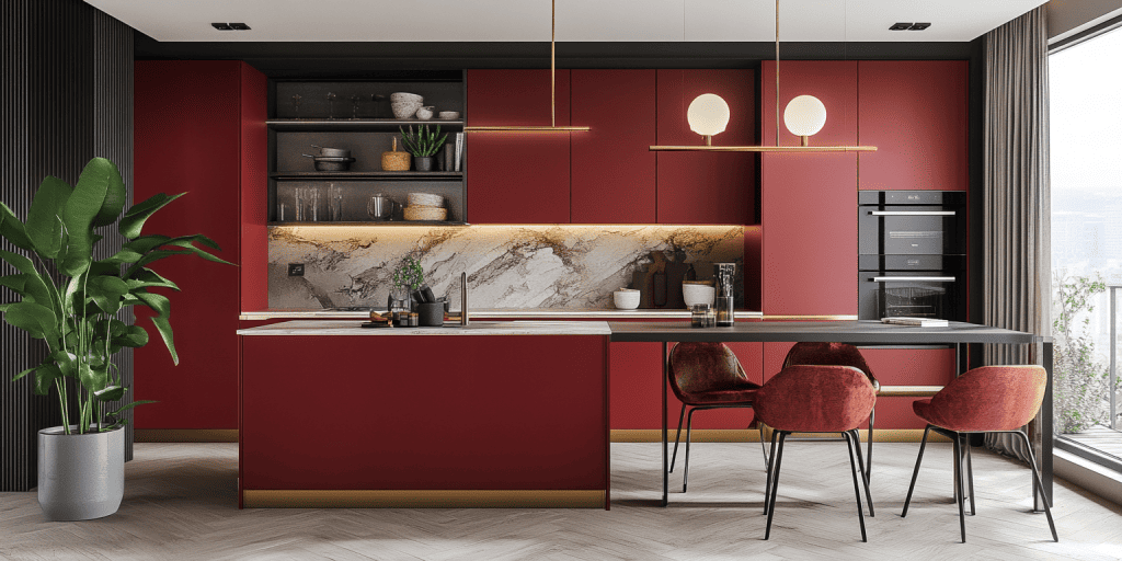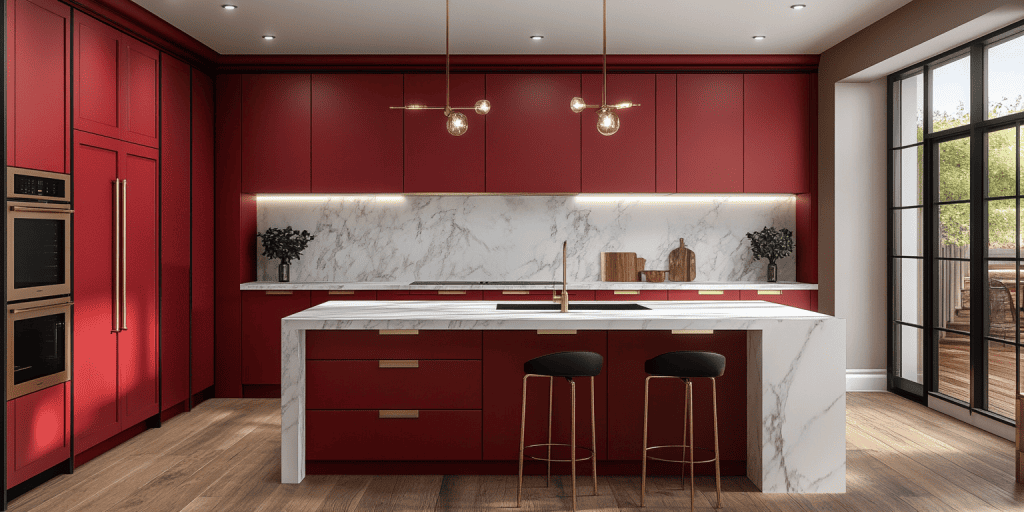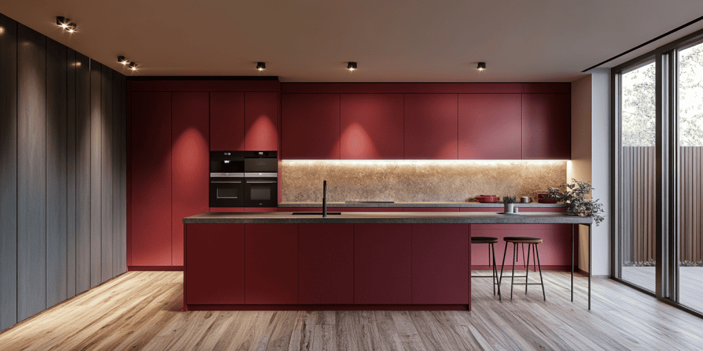 1. Sleek Matte Crimson Cabinets For Bold Look