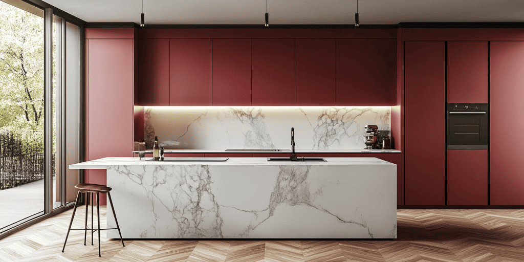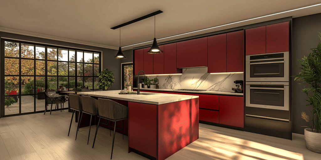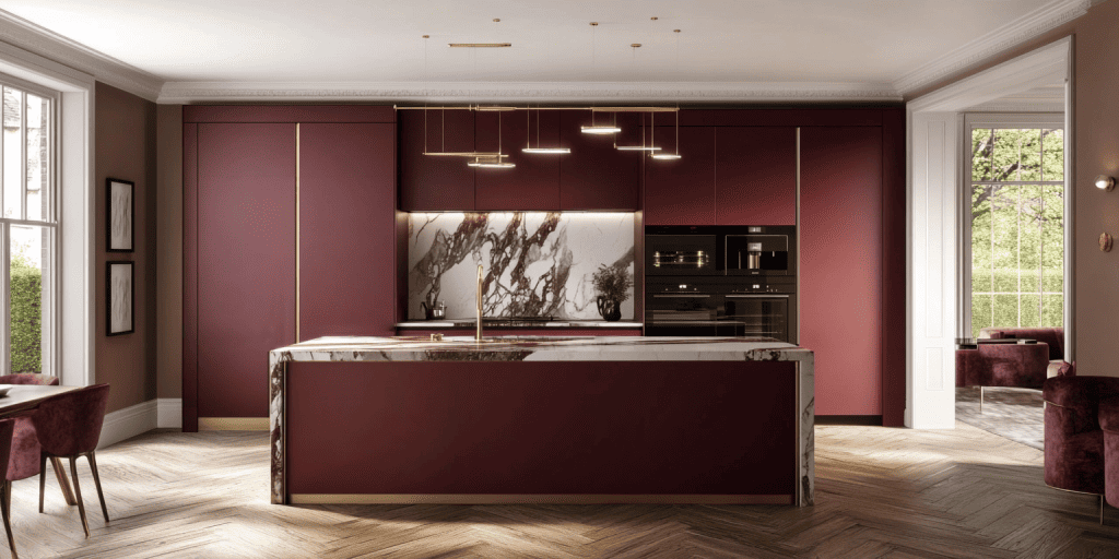 Dark red kitchen ideas often lean towards deeper tones like burgundy. It feels rich, timeless, and works beautifully with brass and gold accents. Book this red kitchen with our best kitchen brand in the UK.