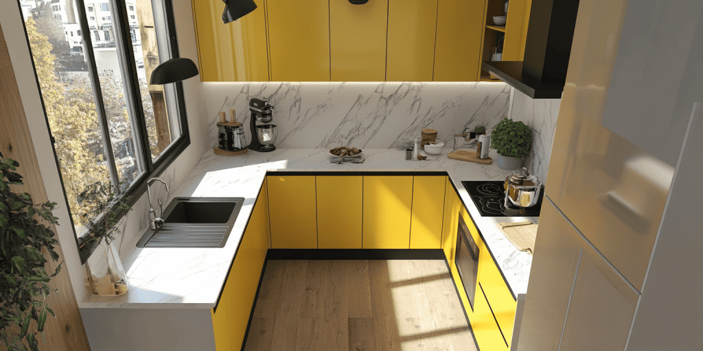 This modern U-shaped layout is a great choice for small yellow kitchen ideas. Sleek handleless cabinets in matt finish and white countertop help balance function and style. This cozy yet bold yellow kitchen theme UK offers a seamless look while maximising storage.