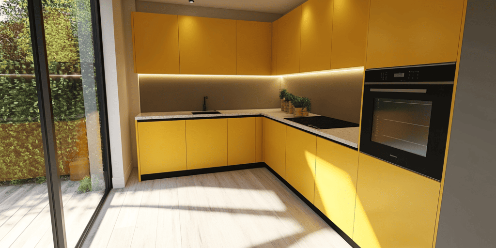 Deep yellow matte cabinetry paired with handleless doors creates a streamlined look. This design is amongst the best yellow kitchen ideas small homes can adopt. Thus, offering practicality without losing vibrancy. It demonstrates how bold yellow kitchen paint ideas can energise compact spaces while keeping layouts functional and stylish.