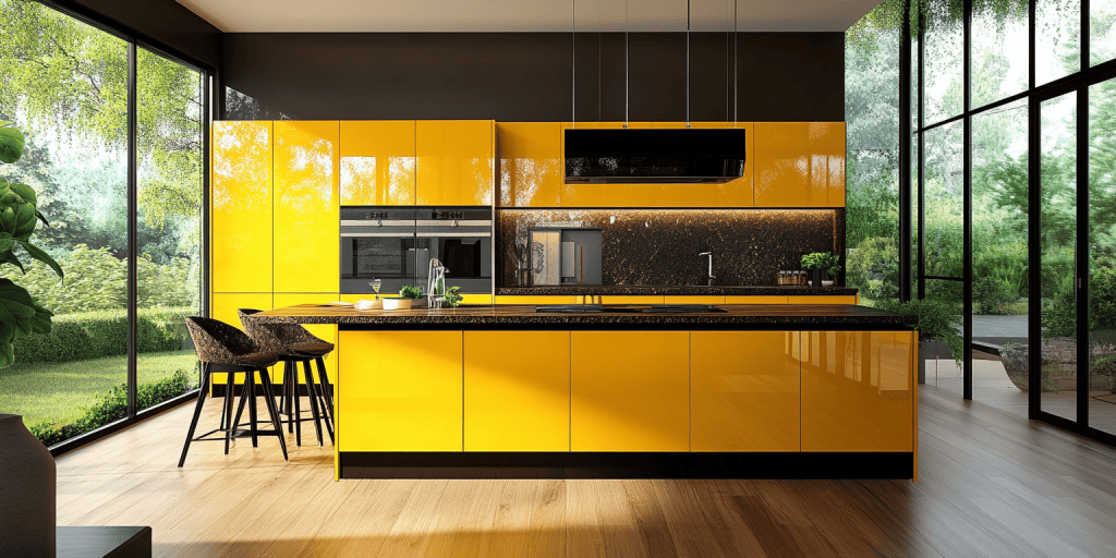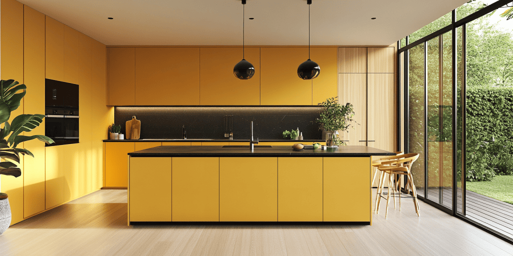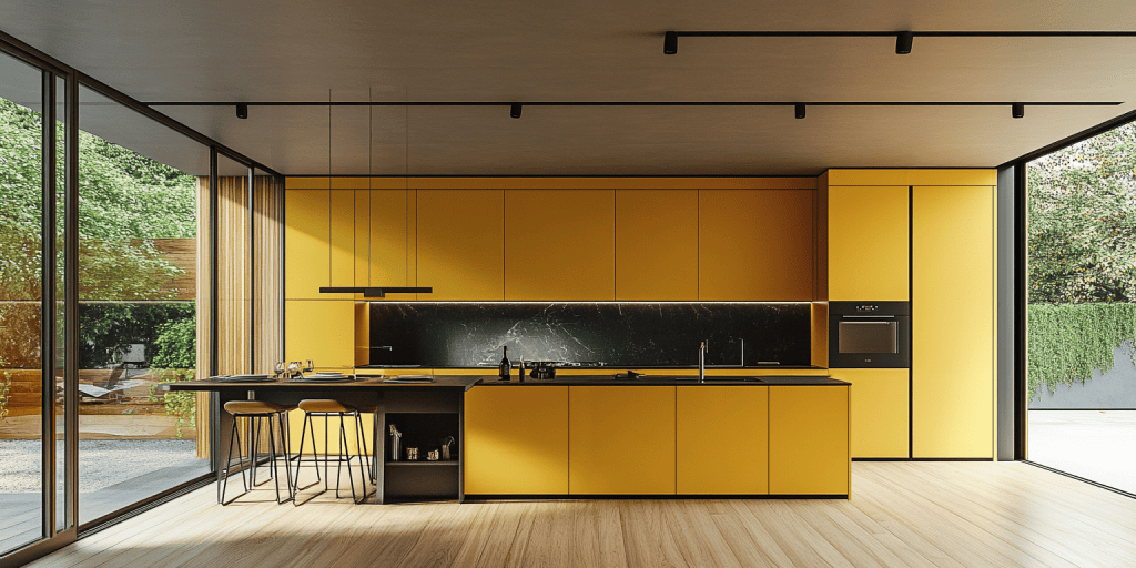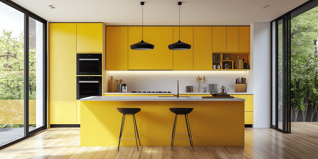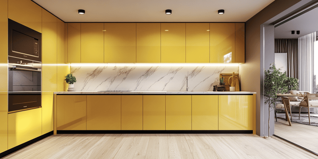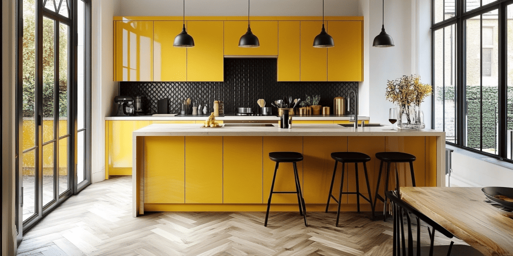 Here’s a bold yellow kitchen design idea paired with a dark splashback for extra drama. A perfect example of yellow kitchen colour ideas, the contrast creates sophistication. Among yellow kitchen ideas small or large layouts can use, this one highlights how deep yellow colour can redefine modern interiors.