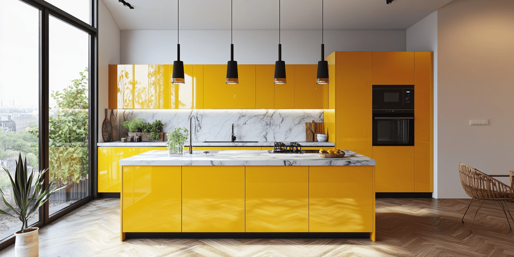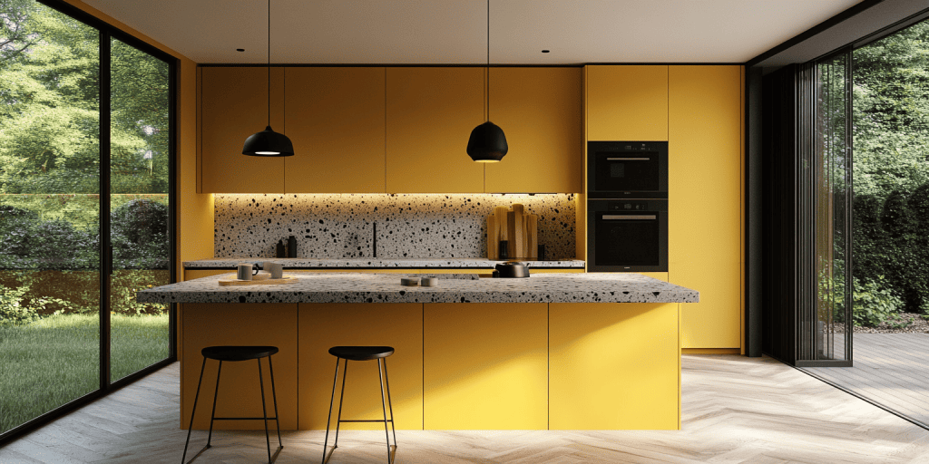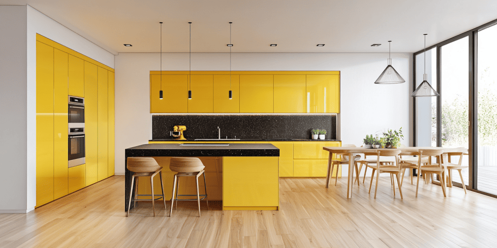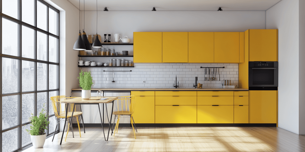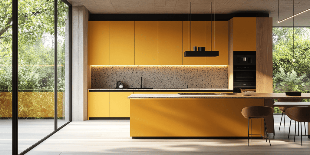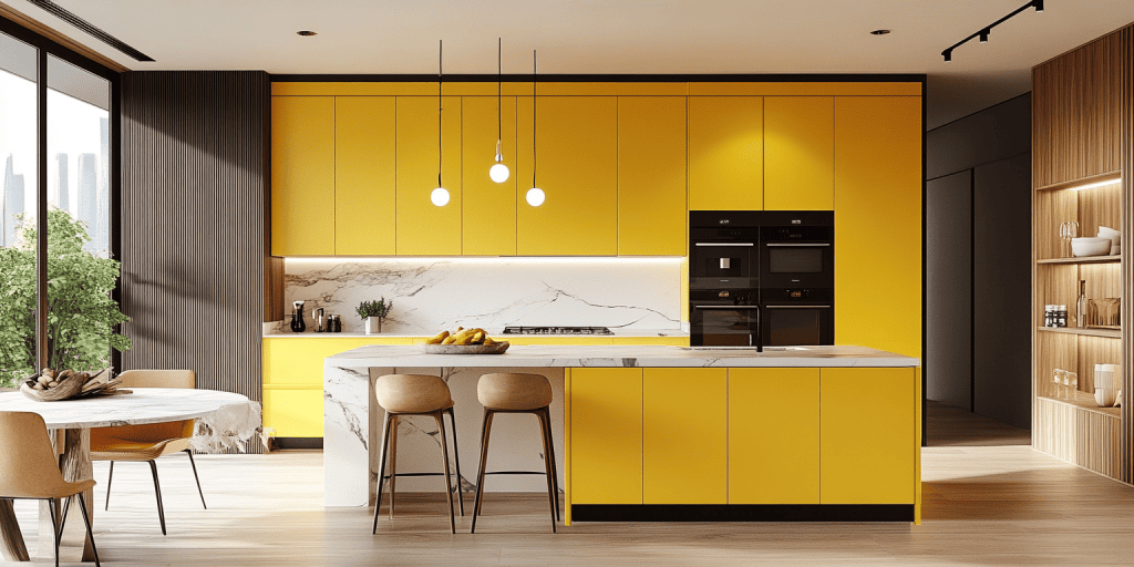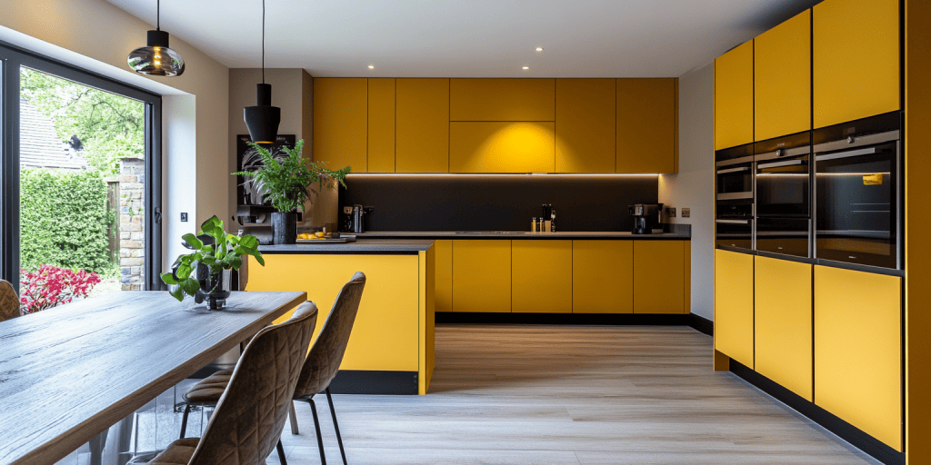 Here’s a bold yellow kitchen design idea paired with a dark splashback for extra drama. A perfect example of yellow kitchen colour ideas, the contrast creates sophistication. Among yellow kitchen ideas small or large layouts can use, this one highlights how deep yellow colour can redefine modern interiors.