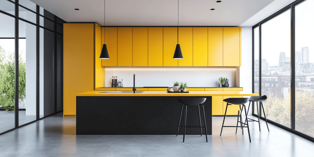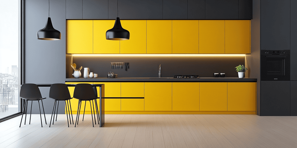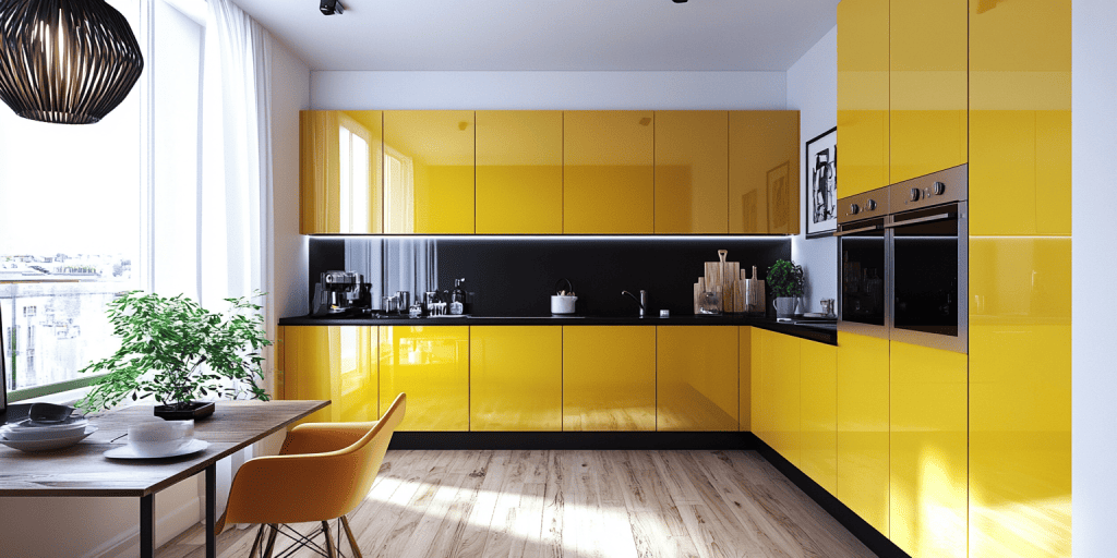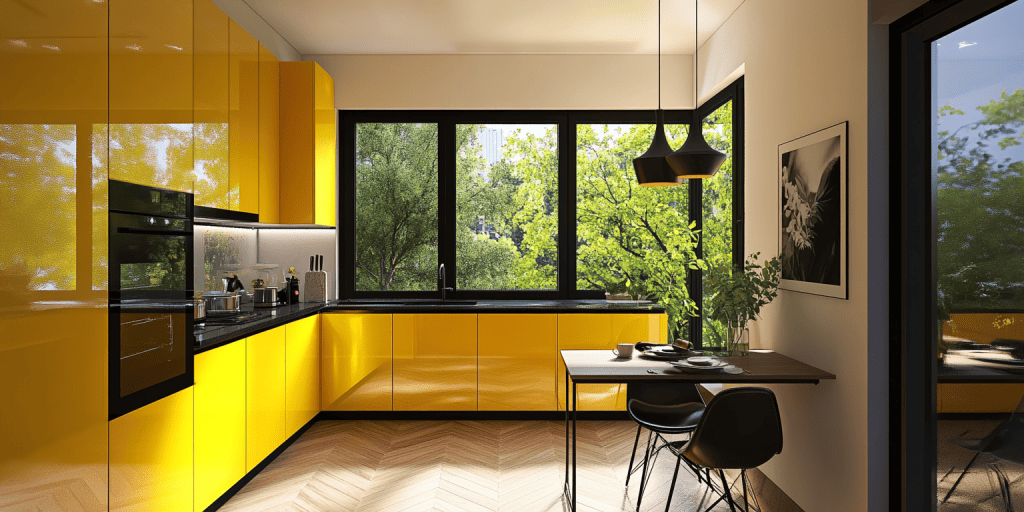 This new-age small kitchen uses bright yellow cabinets with black accents for contrast. A bold example of yellow kitchen ideas, the vibrant tone energizes daily routines and reflects a fresh kitchen theme.