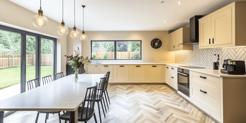 Smartly designed, this compact yellow kitchen saves every inch of space while keeping style intact. If you’re living in small homes or apartments, then this kitchen will help you maximise on your kitchen space and offer you more storage. By merging storage with function, this yellow kitchen design idea in UK is perfect for compact layouts and turns the space brighter, cozier and full of personality.