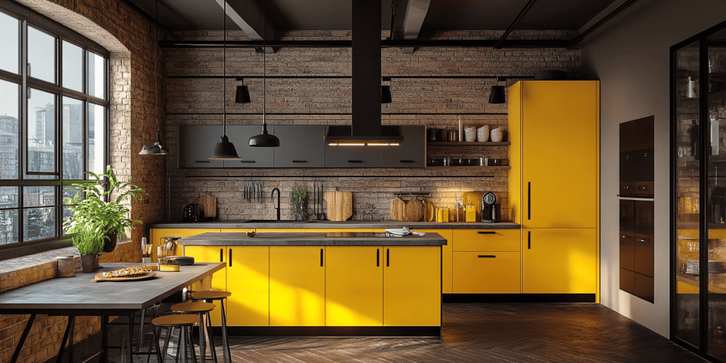 Industrial elements blend with yellow cabinetry for a unique modern look. If you’re exploring yellow kitchen décor ideas with an edge, this one’s for you. Get a hold of how raw textures like the bricks that truly turn the kitchen appealing. It’s a perfect way to showcase how such textures can enhance bold yellow kitchen ideas in stylish ways.